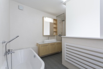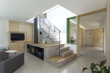 Dodali jsme nové železobetonové schodiště s dřevěnými nášlapy. V prvním nadzemním podlaží jsme zhotovili lité podlahy (leštěný drátkobeton s dodatečným sypem).