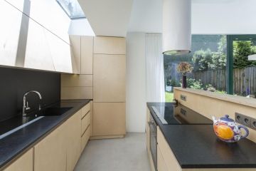 Původní sedlovou střechu jsme nahradili asymetrickou mansardovou střechou se svislou spodní částí a pultovou částí směrem do ulice. Tato změna umožnila využít podkroví jako obytný prostor, což dříve nebylo možné.